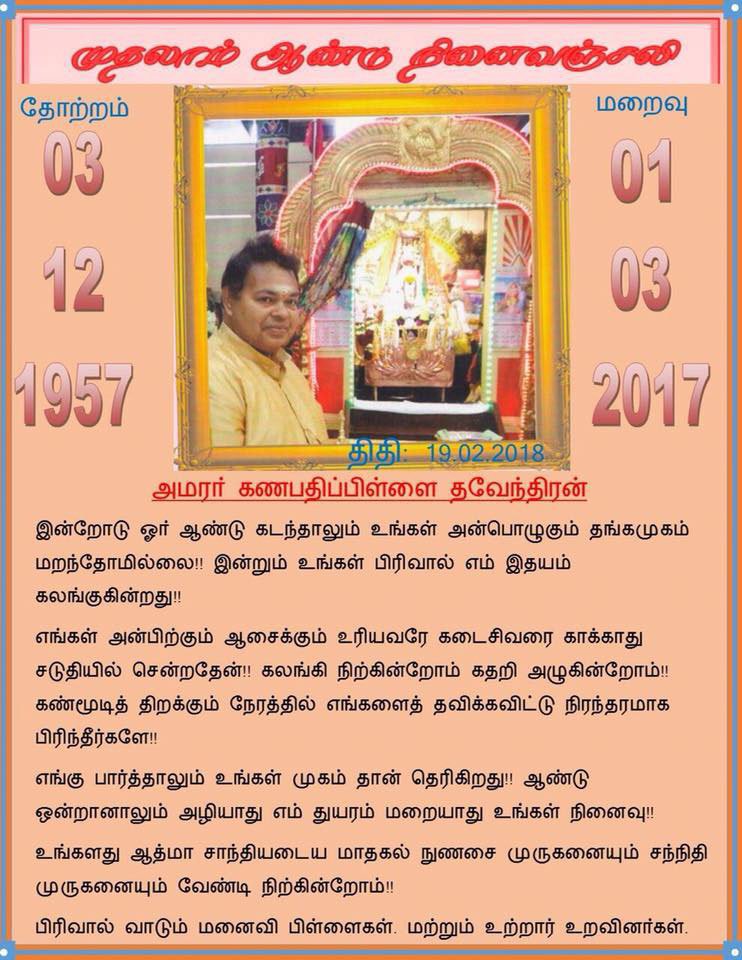 தவேந்திரன் கணபதிப்பிள்ளை அவர்களின் முதலாவது ஆண்டு நினைவேந்தல்...